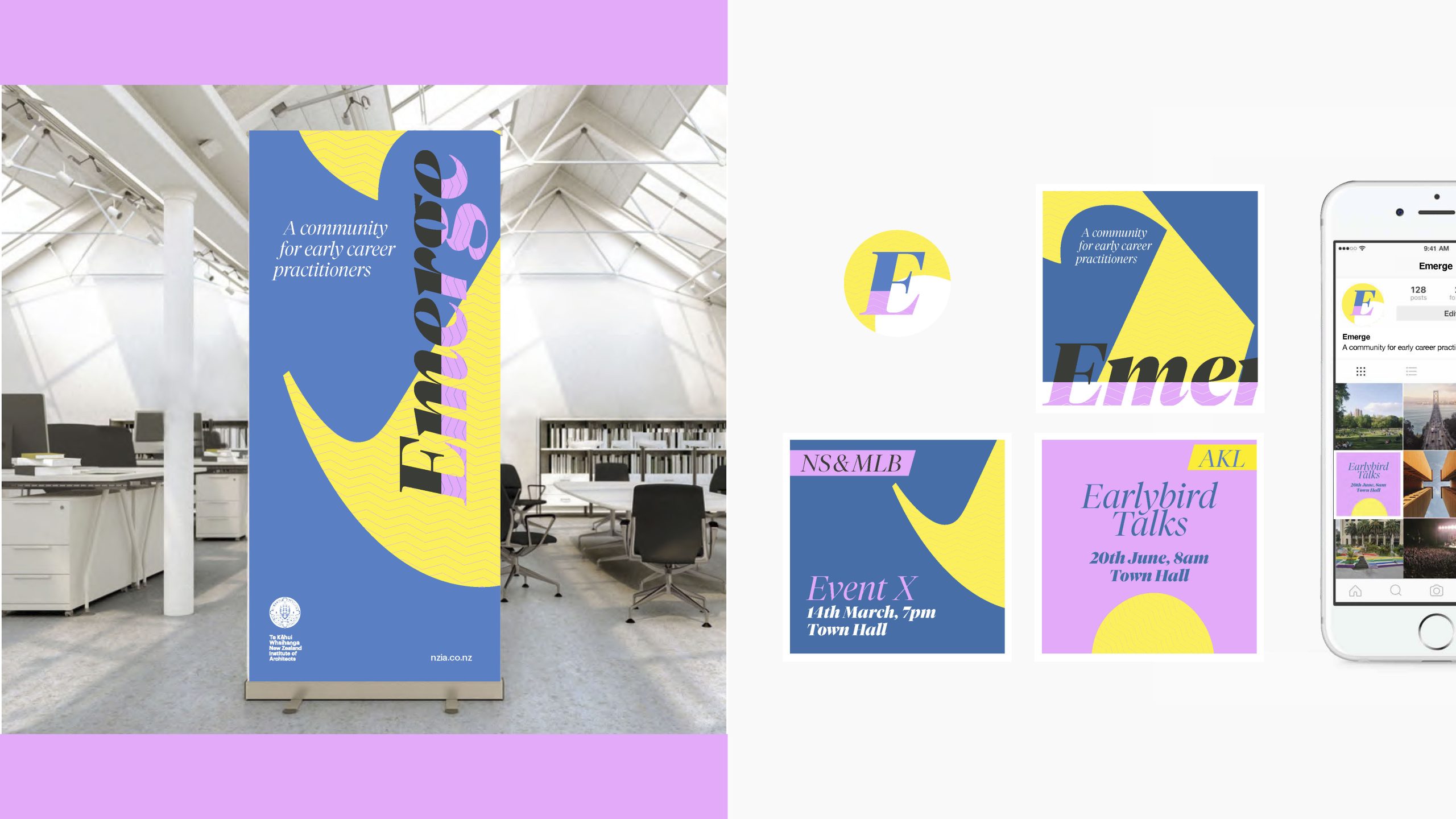Brand development and implementation of Te Kāhui Whaihanga Emerge – a platform set up to support new, architectural graduates in their practice. Illustrations for themed post to promote mental health support (this was especially during pandemic lockdowns) in partnership with Raise.