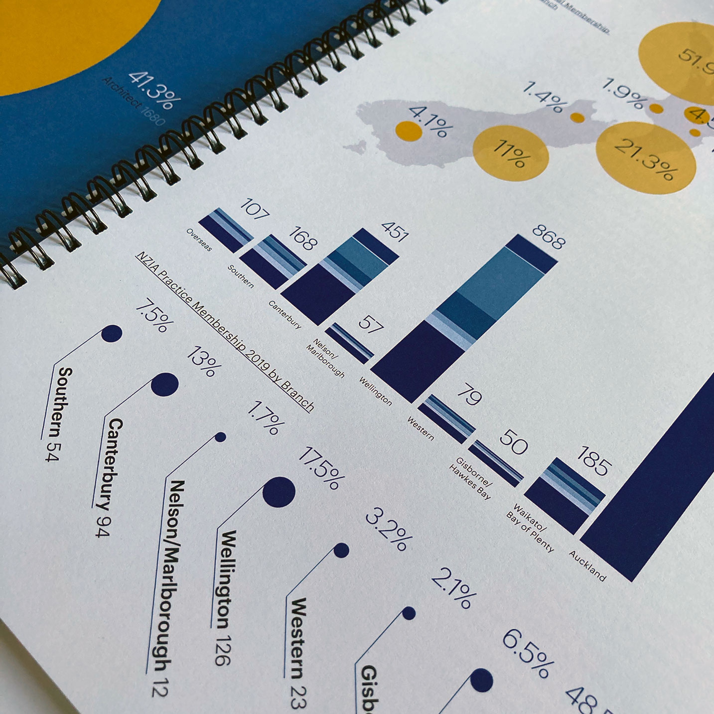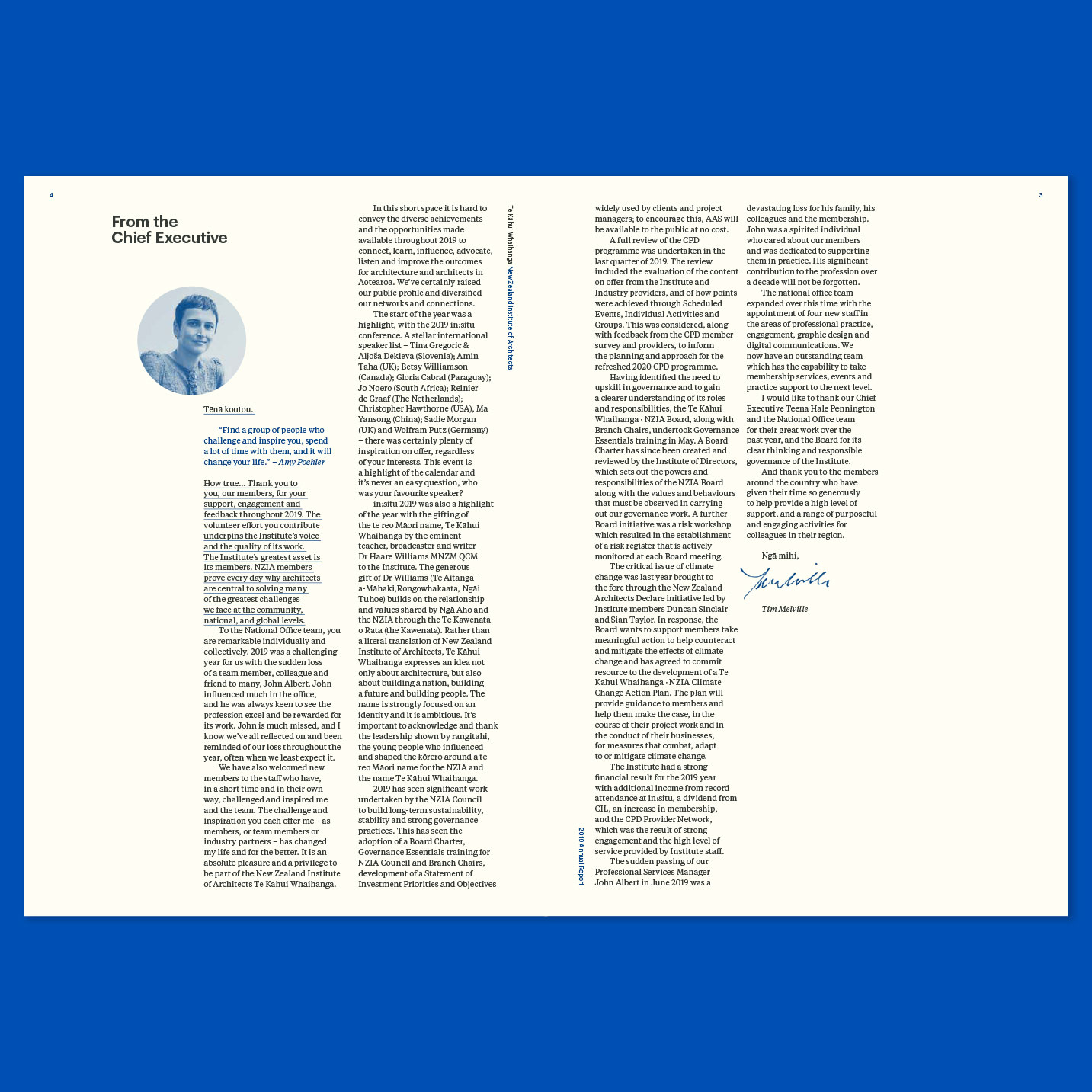 Design and production of the 2019 Annual report for Te Kāhui Whaihanga NZIA. Including infographic illustrations and print management.